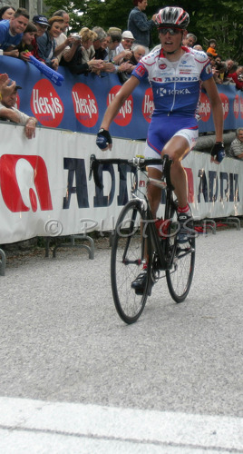 : Winner of second stage Tomaz Nose of Slovenia and Adria Mobil celebrates his stage victory while crossing finish line at Sveta Gora, Slovenia (681m) in second stage of 13th Tour de Slovenie 2006 (13. dirka Po Sloveniji). Stage 2 in lenght of 183km lead cyclists from Medvode, Slovenia to Sveta Gora near Nova Gorica, Slovenia.