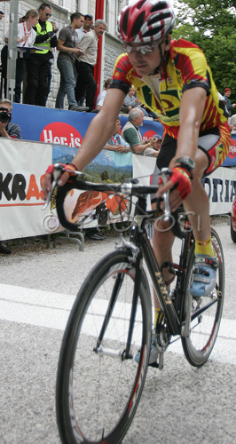 Nova Gorica ,Slovenia - 09.06.2006 : Jure Golcer of Slovenia and Perutnina Ptuj crosses finish line at Sveta Gora, Slovenia (681m) in second stage of 13th Tour de Slovenie 2006 (13. dirka Po Sloveniji) as second. Stage 2 in lenght of 183km lead cyclists from Medvode, Slovenia to Sveta Gora near Nova Gorica, Slovenia. Photo by: Mitja Smid Bricelj/PhotoSI