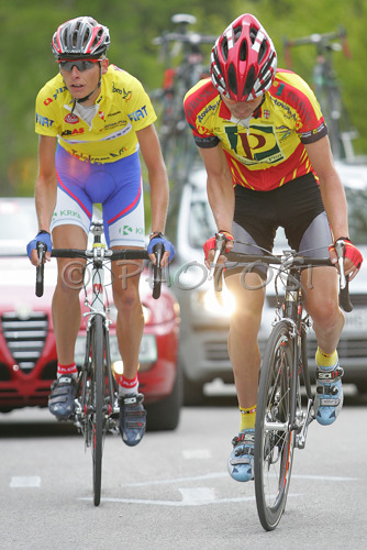 : Tomaz Nose of Adria Mobil (L) and Jure Golcer of Perutnina Ptuj (R) fighting with last meters of uphill to Vrsic, Slovenia during third stage of 13th Tour de Slovenie 2006 (13. dirka Po Sloveniji). Third stage lead cyclists in lenght of 158km from Nova Gorica, Slovenia to top of Vrsic, Slovenia. Last uphill to Vrsic was also hardest uphill on this years Tour de Slovenia and it usually also decides winner of Tour.