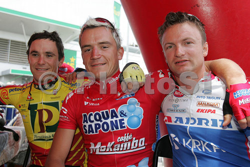 : Three musketeer in sprint discipline, Borut Bozic of Perutnina Ptuj (L), Jure Zrimsek of Acqua Sapone Caffe Mokamba (M) and Zoran Klemencic of Adria Mobil (R) before start of fourth stage of 13th Tour de Slovenie 2006 (13. dirka Po Sloveniji). Stage 4 in lenght of 156km lead cyclists from Grosuplje, Slovenia to Novo mesto, Slovenia.