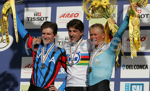 Salzburg ,Austria - 20.09.2006 : Winer and World Champion Cancellara Fabian of Switzerland (M), second placed Zabriskie David of Usa (L) and third placed Vinokurov Alexandr of Kazakhstan (R) celebrating their medals after Men Elite Time trial race of Road Cycling World Championship in Salzburg, Austria. Elite Men Time trial race was held in Salzburg, Austria on 21. September 2006. Photo by: Mitja Smid Bricelj/PhotoSI