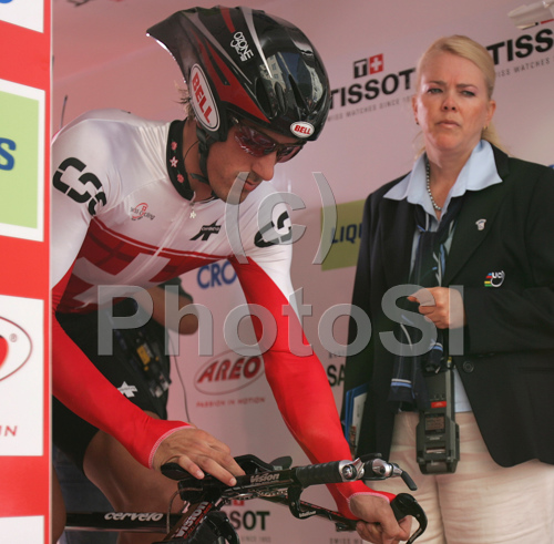 : Winner Cancellara Fabian of Switzerland getting ready for start of Men Elite Time trial race of Road Cycling World Championship in Salzburg, Austria. Elite Men Time trial race was held in Salzburg, Austria on 21. September 2006.