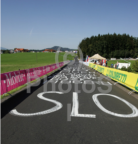 : Slovenian fans painted the road with names of Slovenian riders during Men Elite road races of Road Cycling World Championship in Salzburg, Austria. Men Elite road race was final race of Road Cycling World Championship 2006 and was held in Salzburg, Austria on 24. September 2006.