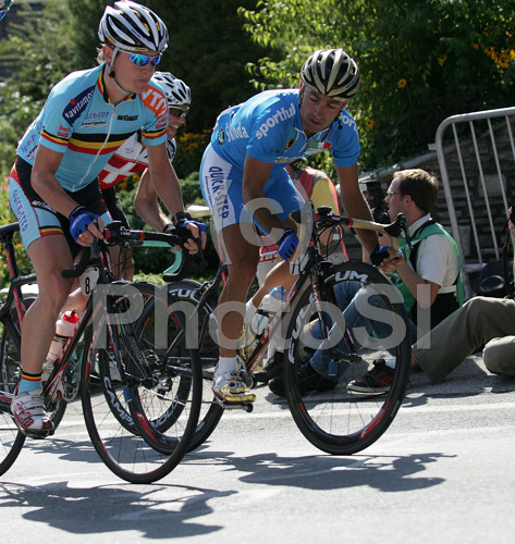 : World Champion Paolo Bettini of Italy (R) and Nick Nuyens of Belgium (L) are climbing during Men Elite road races of Road Cycling World Championship in Salzburg, Austria. Men Elite road race was final race of Road Cycling World Championship 2006 and was held in Salzburg, Austria on 24. September 2006.