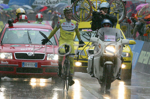 : Winner Iban Mayo Diez Saunier Duval-Prodir celebrating his victory in the stage 19 of Giro d Italia 2007. Stage 19 in length of 178km lead cyclists from Treviso, Italy to Terme di Comano, Italy, and was held on 1st of June 2007.
