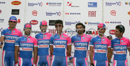 : Team Lampre Fondital before start of first stage of Tour de Slovenie 2007. First stage of Tour de Slovenie 2007 in lenght of 182km lead cyclists from Ljubljana, Slovenia to Zagreb, Croatia, and was held on 12th of June 2007.