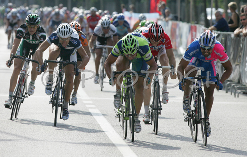 Zagreb ,Croatia - 12.02.2007 : Winner Danilo Napolitano of Lampre Fondital (R), second placed Francesco Chicchi of Liquigas (3rd from L), third placed Gabrielle Balducci of Acqua e Sapone & Caffe Mokambo (2nd from R), fourth placed Enrico Rossi of OTC Doors Laurentana (2nd from L) and fifth placed Borut Bozic of Team L.P.R.(L) sprinting in finish sprint of first stage of Tour de Slovenie 2007. First stage of Tour de Slovenie 2007 in lenght of 182km lead cyclists from Ljubljana, Slovenia to Zagreb, Croatia, and was held on 12th of June 2007. Photo by: Mitja Smid Bricelj/PhotoSI