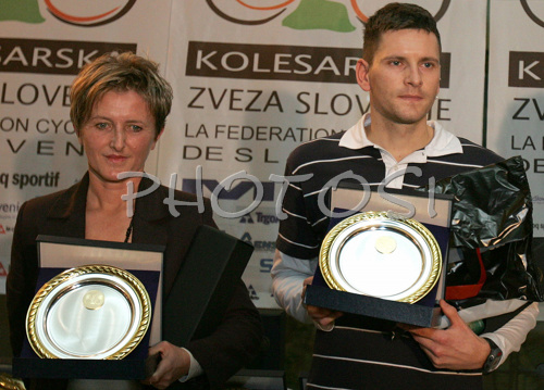 : The best female cyclist Jelka Rakus (L) and male cyclist Ales Krapez (R) in category of recreation road cycling during award ceremony Vecer zvezd (Night of stars) organized by Cycling federation of Slovenia. Award ceremony was held 13th December 2006 in BTC City - Aqua park Atlantis, Ljubljana, Slovenia.