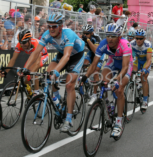 : Gorazd Stangelj of Lampre Fondital (R) entering second lap through Riese Pio X during the stage 18 of Giro d Italia 2007. Stage 18 in length of 208km lead cyclists from Udine, Italy to Riese Pio X, Italy, and was held on 31st of May 2007..