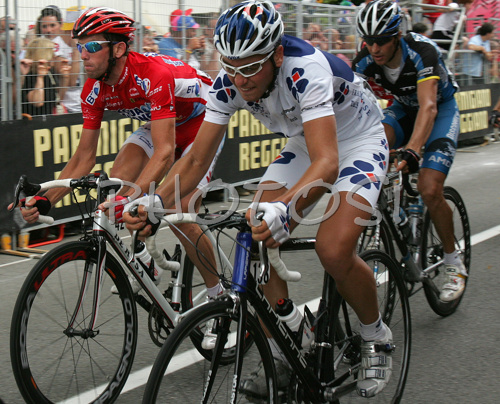 : Fabien Patanchon of Francaise des Jeux (R) is followed by Dario Andriotto of Acqua e Sapone & Caffe Mokambo (L) when riding during the stage 18 of Giro d Italia 2007. Stage 18 in length of 208km lead cyclists from Udine, Italy to Riese Pio X, Italy, and was held on 31st of May 2007..