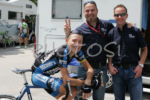 : Jani Brajkovic of Discovery Channel Pro cycling team (L), with his manager Milan Erzen (M) and sports director of Adria Mobil Bostjan Mervar (R) before start of second stage of Tour de Slovenie 2007. Second stage in lenght of 163km lead cyclists from Sentjernej, Slovenia to Ljubljana, Slovenia, where finish line was in Ljubljana castle.