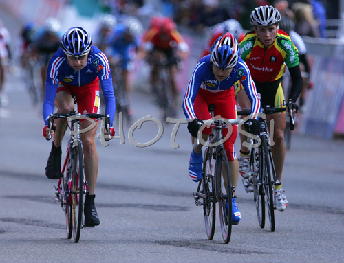 : Jeannie Longo-Ciprelli of France (R) and Edwige Pitel of France (L) coming to finish of Women Elite road races of UCI Road Cycling World Championships. Women Elite road race World Championships was held on 29th of September 2007 in Stuttgart, Germany.