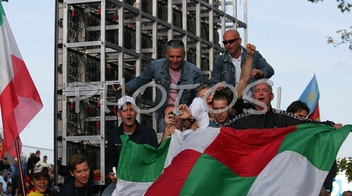 : Italian fans celebrating victory of Paolo Bettini of Italy in Men Elite road race of UCI Road Cycling World Championships. Men Elite road race World Championships was held on 30th of September 2007 in Stuttgart, Germany.