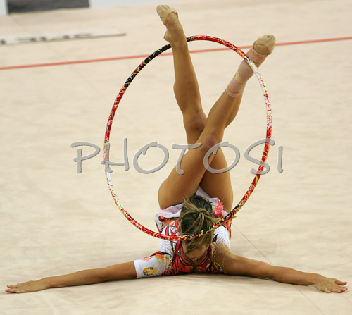 : Almudena Cid of Spain performing during her exercise with hoop in Rhythmic gymnastics World Cup 2007. 9th Slovene Challenge Tournament in Rhythmic gymnastics and World Cup in Rhythmic gymnastics was held in Ljubljana, Slovenia on 26th of August 2007.