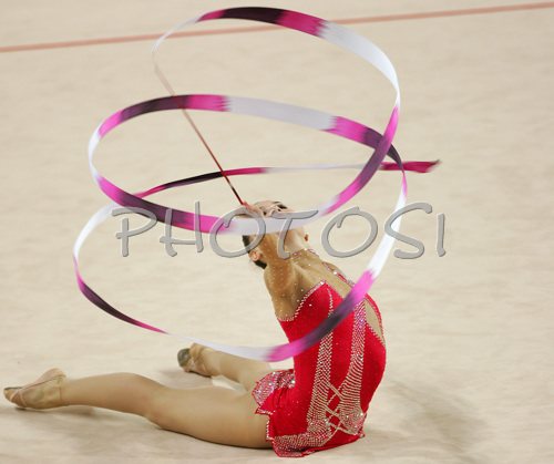 : Irena Risenzon of Israel performing during her exercise with ribbon in Rhythmic gymnastics World Cup 2007. 9th Slovene Challenge Tournament in Rhythmic gymnastics and World Cup in Rhythmic gymnastics was held in Ljubljana, Slovenia on 26th of August 2007.