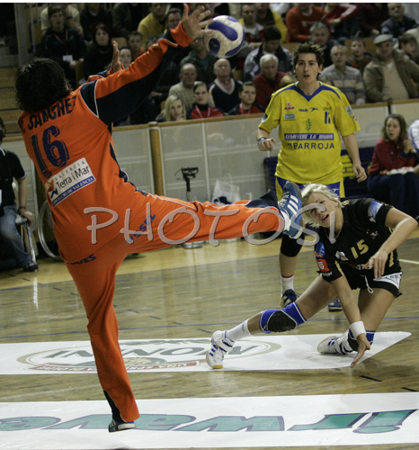 : Dijana Golubic (no.15) of Krim Mercator (R) shooting on goal while Maria Eugenia Sanchez (no.16) of Cementos la Union-Ribarroja (L) is trying to keep her goal closed during Women Handball Championships League match between Krim Mercator and Cem. la Union-Ribarroja. Krim Mercator, Ljubljana, Slovenia was hosting match of 6th round of Women Handball Championships League against Cem. la Union-Ribarroja, Alaquas, Spain, in Tivoli Arena on 24th of February 2007. Match was won by Krim Mercator with result 34:28.
