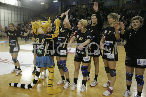 : Players of Krim Mercator celebrating their victory after end of play time in Women Handball Championships League match between Krim Mercator and Cem. la Union-Ribarroja. Krim Mercator, Ljubljana, Slovenia was hosting match of 6th round of Women Handball Championships League against Cem. la Union-Ribarroja, Alaquas, Spain, in Tivoli Arena on 24th of February 2007. Match was won by Krim Mercator with result 34:28.