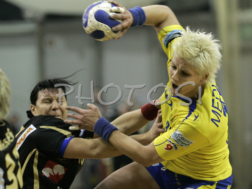 Ljubljana ,Slovenia - 24.02.2007 : Tatjana Medved (no.31) of Cementos la Union-Ribarroja (R) shooting on goal while Katja Kurent Tatarovac (no.19) of Krim Mercator (L) is trying to block her during Women Handball Championships League match between Krim Mercator and Cem. la Union-Ribarroja. Krim Mercator, Ljubljana, Slovenia was hosting match of 6th round of Women Handball Championships League against Cem. la Union-Ribarroja, Alaquas, Spain, in Tivoli Arena on 24th of February 2007. Match was won by Krim Mercator with result 34:28. Photo by: Primoz Jeroncic/PhotoSI