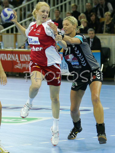 : Petra Popluharova (no.17) of 1.FC Nurnberg (L) trying to score, while Gabriella Kindl (no.77) of Krim (R) is trying to hinder her during match of 2nd round of EHF Women Handball Champions League between RK Krim, Ljubljana, Slovenia and 1.FC Nurnberg, Germany. Match ended with victory of 1.FC Nurnberg, who defeated RK Krim with 30:31. Match between RK Krim and 1.FC Nurnberg was played in Tivoli Arena in Ljubljana, Slovenia on 3. November 2007.