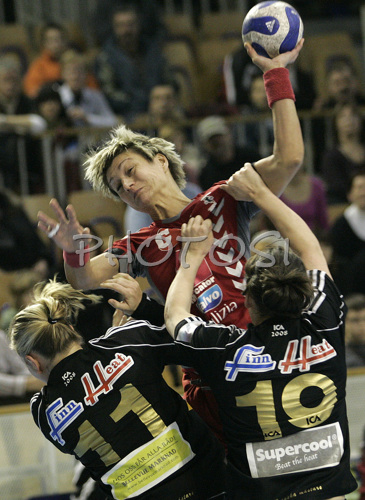 : Anja Freser (no.11) of Krim (M) shooting between Cecilia Grubbstrom (no.11) of IK Savehof (L) and Charlotte Brandt (no.19) of IK Savehof during match of 5th round of European Champions handball league. Match between RK Krim, Ljubljana, Slovenia, and IK Savehof, Partille, Sweden was played on 5th of January 2008 in Tivoli Arena in Ljubljana, Slovenia. Match was with draw 24:24.