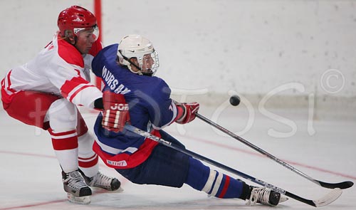 : Michael Eskesen of Denmark (L) and Jan Mursak of Slovenia figthing for puck during ice hockey match between Slovenia and Denmark on Ice Hockey World Championship Division I, Group A. Denmark won with 3:2, which gives them good chances for winning tournament and qualifying for Elite Division.