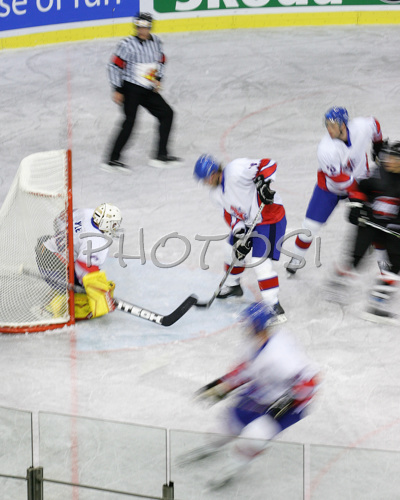 : Players of Great Britain and Japan infront of goalie Stevie Lyle (no.30) of Great Britain during first match of IIHF Division 1 World championships between Great Britain and Japan. Match was won by Great Britain who defeated Japan with 4:3. Match was played in Tivoli Arena in Ljubljana, Slovenia on 15th of April 2007.