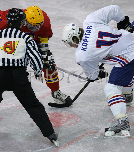 Ljubljana ,Slovenia - 15.04.2007 : Anze Kopitar (no.11) of Slovenia (R) fighting for puck during match of IIHF Division 1 World championships between Slovenia and Romania. Match was won by Slovenia who defeated Romania with 10:1. Match was played in Tivoli Arena in Ljubljana, Slovenia on 15th of April 2007. Photo by: Primoz Jeroncic/PhotoSI