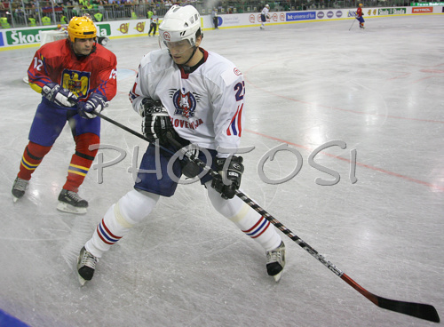 : Marcel Rodman (no.22) of Slovenia (R) and Viorel Nicolescu (no.12) of Romania (L) during second third of match of IIHF Division 1 World championships between Slovenia and Romania. Match was won by Slovenia who defeated Romania with 10:1. Match was played in Tivoli Arena in Ljubljana, Slovenia on 15th of April 2007.