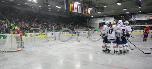 : Players of Slovenia celebrating goal during last third of match of IIHF Division 1 World championships between Slovenia and Romania. Match was won by Slovenia who defeated Romania with 10:1. Match was played in Tivoli Arena in Ljubljana, Slovenia on 15th of April 2007.