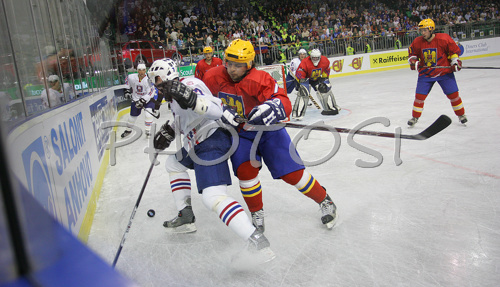 Ljubljana ,Slovenia - 15.04.2007 : Jurij Golicic (no.17) of Slovenia (L) fighting for puck during last third of match of IIHF Division 1 World championships between Slovenia and Romania. Match was won by Slovenia who defeated Romania with 10:1. Match was played in Tivoli Arena in Ljubljana, Slovenia on 15th of April 2007. Photo by: Primoz Jeroncic/PhotoSI