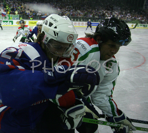 : Jaka Avgustincic (no.21) of Slovenia (L) and Balazs Kangyal (no.25) of Hungary (R) going for puck during match of IIHF Division 1 World championships between Slovenia and Hungary. Match was won by Slovenia who defeated Hungary with 4:1. Match was played in Tivoli Arena in Ljubljana, Slovenia on 16th of April 2007.