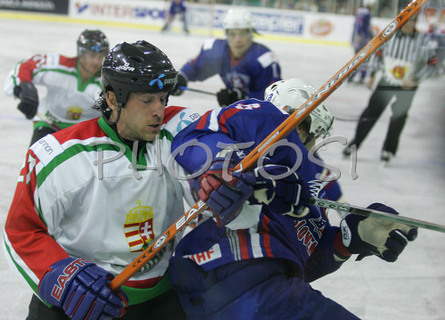 Ljubljana ,Slovenia - 16.04.2007 : Tomo Hafner (no.8) of Slovenia (R) and Tamas Sille (no.27) of Hungary (L) during match of IIHF Division 1 World championships between Slovenia and Hungary. Match was won by Slovenia who defeated Hungary with 4:1. Match was played in Tivoli Arena in Ljubljana, Slovenia on 16th of April 2007. Photo by: Primoz Jeroncic/PhotoSI