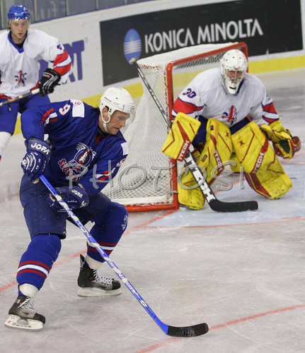 : Tomaz Razingar (no.9) of Slovenia going for goal during match of IIHF Division 1 World championships between Slovenia and Great Britain. Match was won by Slovenia who defeated Great Britain with 4:0. Match was played in Tivoli Arena in Ljubljana, Slovenia on 18th of April 2007.