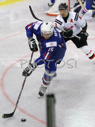 : Egon Muric (no.15) of Slovenia (F) and Kengo Ito (no.3) of Japan (B) during match of IIHF Division 1 World championships between Slovenia and Japan. Match was won by Slovenia who defeated Japan with 7:1. Match was played in Tivoli Arena in Ljubljana, Slovenia on 19th of April 2007.