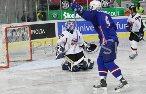 Ljubljana ,Slovenia - 19.04.2007 : Tomaz Razingar (no.9) of Slovenia scoring during match of IIHF Division 1 World championships between Slovenia and Japan. Match was won by Slovenia who defeated Japan with 7:1. Match was played in Tivoli Arena in Ljubljana, Slovenia on 19th of April 2007. Photo by: Primoz Jeroncic/PhotoSI