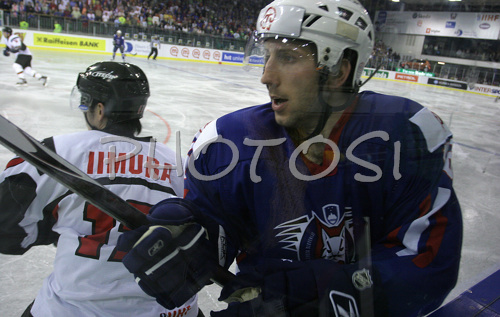 : Milan Hafner (no.16) of Slovenia (R) and Yoshinori Iimura (no.17) of Japan (L) during match of IIHF Division 1 World championships between Slovenia and Japan. Match was won by Slovenia who defeated Japan with 7:1. Match was played in Tivoli Arena in Ljubljana, Slovenia on 19th of April 2007.