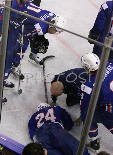 : Anze Terlikar (no.24) of Slovenia injured after hitting wall during match of IIHF Division 1 World championships between Slovenia and Lithuania. Match was won by Slovenia who defeated Lithuania with 4:2. Match was played in Tivoli Arena in Ljubljana, Slovenia on 21. of April 2007.