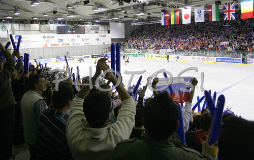 : Slovene supporters during match of IIHF Division 1 World championships between Slovenia and Lithuania. Match was won by Slovenia who defeated Lithuania with 4:2. Match was played in Tivoli Arena in Ljubljana, Slovenia on 21. of April 2007.