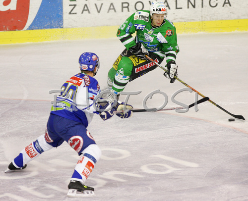 : Egon Muric (no.15) of ZM Olimpija (R) and Mickey Elick (no.20) of EC VSV (L) during match of 26th round of EBEL League between ZM Olimpija, Ljubljana, Slovenia and EC VSV, Villach, Austria. Match was won by EC VSV who defeated ZM Olimpija with 1:3. Match was played in Tivoli Arena in Ljubljana, Slovenia on 30th of November 2007.