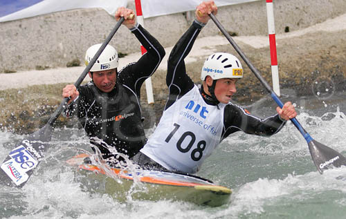 : Aljaz Kulovec (front) and Simon Hocevar (back) of Slovenia (KK Simon) paddling during first run of second International kayak and canoe slalom race Tacen 2006 in Tacen, Slovenia. Races of International kayak and canoe slalom Tacen 2006 also counted as third and fourth qualification race for Slovene whitewater kayak and canoe World cup team.