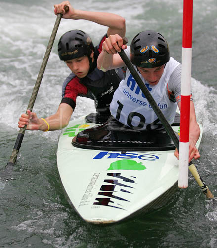 : Luka Bozic and Saso Taljat of Slovenia (Soske elektrarne) paddling during first run of second International kayak and canoe slalom race Tacen 2006 in Tacen, Slovenia. Races of International kayak and canoe slalom Tacen 2006 also counted as third and fourth qualification race for Slovene whitewater kayak and canoe World cup team.