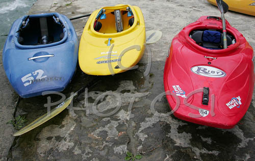 : Kayaks waiting for competitiors before start of final run during first International kayak rodeo race Slofreestyle 2006 which was held in Tacen, Slovenia on 3. June 2006.