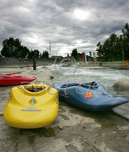: Kayaks waiting for competitiors before start of final run during first International kayak rodeo race Slofreestyle 2006 which was held in Tacen, Slovenia on 3. June 2006.