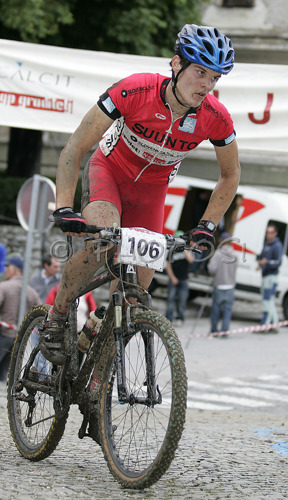 : Jernej Muzga of Suunto Slovenica Novice Extreme (U23) competing during 6th race of Slovene cup in cross country MTB race which was held in Kamnik, Slovenia. Due to week long rain track was wet and full of mud which made racing even more demanding. Women elite, women under 23, men juniors and men masters categories had to finish 5 laps long race, while men elite and men under23 had race long 7 laps.
