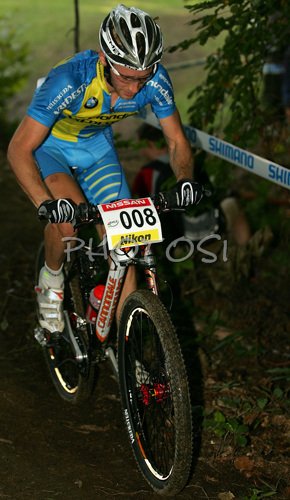 : Winner Fredrik Kessiakoff of Sweden riding in last race of Men Cross country Nissan UCI Mountain Bike World Cup. Final race of MTB World Cup was held in Maribor, Slovenia, on 15th of September 2007.