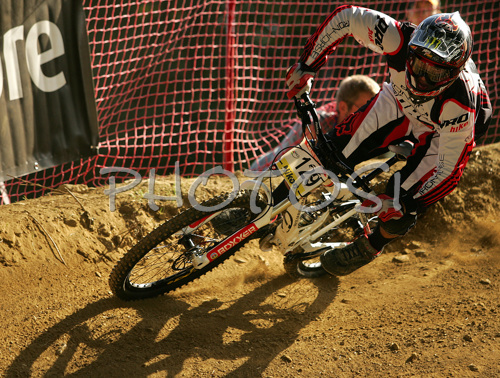 : Paolo Viola of Italy riding in last race of Men Downhill Nissan UCI Mountain Bike World Cup. Final race of MTB World Cup was held in Maribor, Slovenia, on 16th of September 2007.