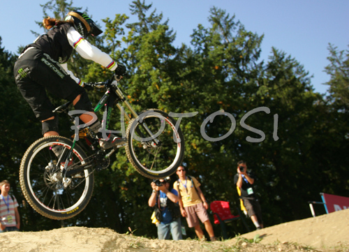 : Sabrina Jonnier of France riding in last race of Women Downhill Nissan UCI Mountain Bike World Cup. Final race of MTB World Cup was held in Maribor, Slovenia, on 16th of September 2007.