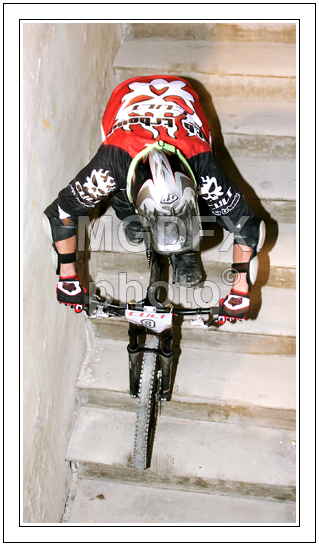 : MTB race in Logatec castle. Cyclists riding between castle walls and down the stairs on Grajski Cult race in Logatec.