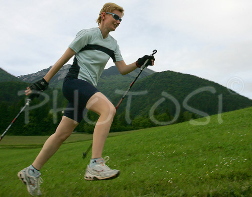 Preddvor ,Slovenia - 26.05.2006 : Nordic walker is enjoying her sport on fields near village Preddvor, Slovenia, on nice late spring afternoon. Nordic walking was first used as a summer training method by cross-country skiers. Nordic walking is one of the fastest growing recreational fitness sports in the world. Nordic walking is fitness walking with specially designed nordic walker poles and offers a very efficient, aerobic and easy way to improve your physical condition irrespective of age, sex or physical condition. Photo by: Primoz Jeroncic/PhotoSI