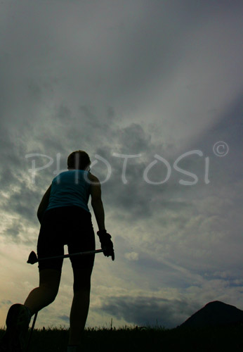 Preddvor ,Slovenia - 26.05.2006 : Nordic walker is enjoying her sport on fields near village Preddvor, Slovenia, on nice late spring afternoon. Nordic walking was first used as a summer training method by cross-country skiers. Nordic walking is one of the fastest growing recreational fitness sports in the world. Nordic walking is fitness walking with specially designed nordic walker poles and offers a very efficient, aerobic and easy way to improve your physical condition irrespective of age, sex or physical condition. Photo by: Primoz Jeroncic/PhotoSI